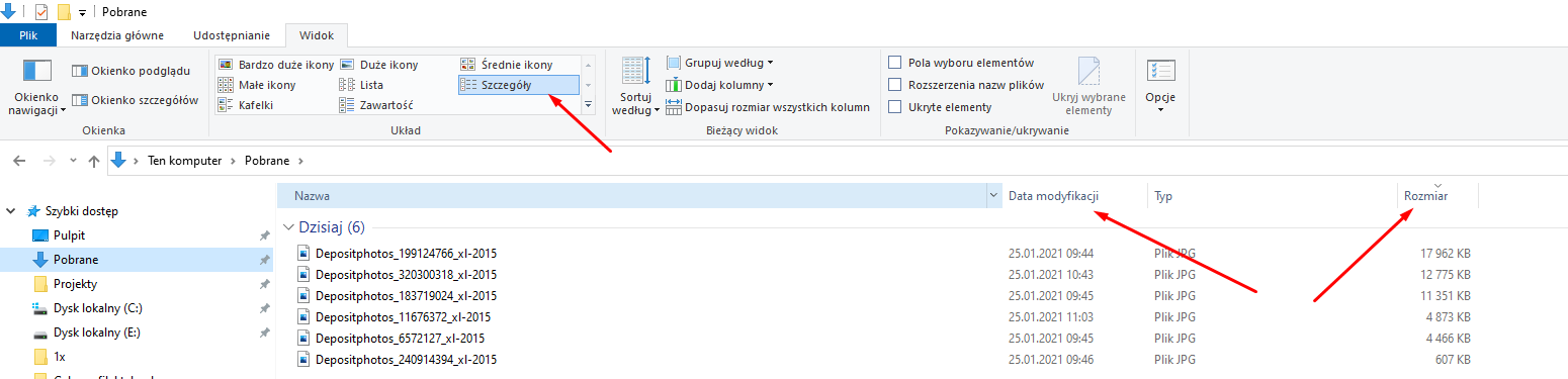 2. Jeszcze prościej przedstawia się sytuacja, gdy uruchamiamy Eksplorator plików. Przeglądanie plików w folderze „Pobrane” sugeruję robić w trybie „Szczegóły”. W ten sposób nie tylko prosto poukładamy wszystko od najstarszego do najnowszego pliku, ale również dowiemy się, który z nich zajmuje najwięcej miejsca. Z tak zorganizowanymi dokumentami, możemy zabrać się za ich czyszczenie.