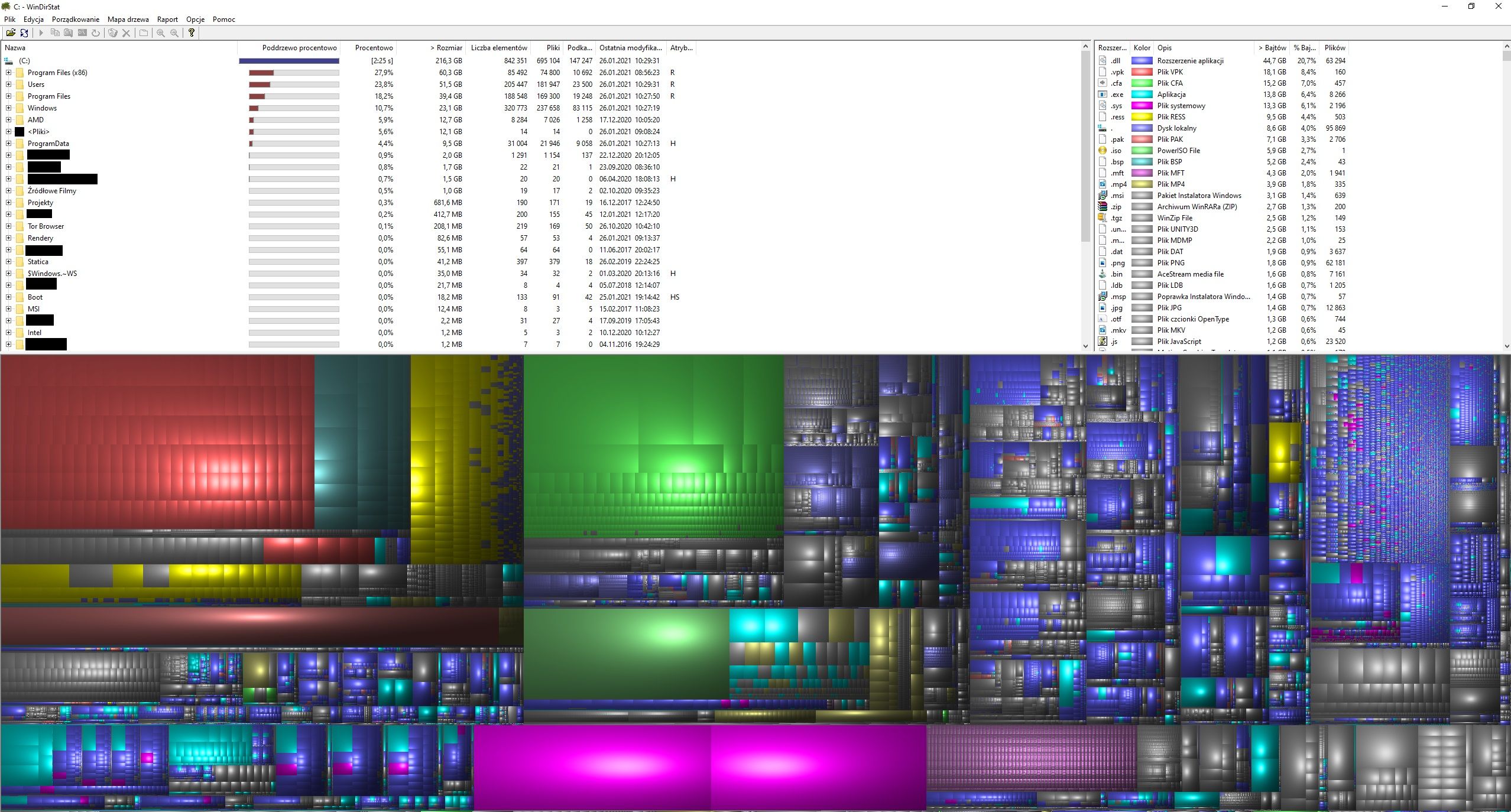 Czasem dzieje się również tak, że nie do końca wiemy, które pliki zajmują najwięcej miejsca i gdzie pochowały się na komputerze. Z pomocą może wtedy przyjść program WinDirStat, który „przeczesze” nasze dyski i powie, gdzie znajdują się zasobożerne dane. WinDirStat to bardzo przydatne narzędzie. Trzeba jednak uważać podczas korzystania z niego. Program ma możliwość kasowania plików systemowych, przez co mniej doświadczeni użytkownicy mogą doprowadzić do uszkodzenia systemu operacyjnego.