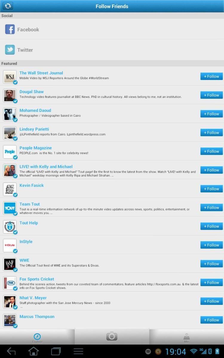 Kolejną, analogiczną aplikacją jest Tout. Stworzona najpóźniej, na fali popularności programów omawianych wcześniej, działa tak samo. Kręcenie rozpoczynamy klikając w ikonę aparatu, w tym programie umieszczoną u dołu ekranu, a następnie klikamy w przycisk „Touch to record”. Tutaj nagrywanie zatrzymujemy ponownie klikając w tę samą ikonę.