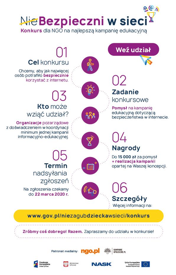 Organizatorem konkursu są Ministerstwo Cyfryzacji oraz Państwowy Instytut Badawczy NASK. Patronat medialny nad naszą inicjatywą objęły portale ngo.pl oraz kampaniespoleczne.pl.