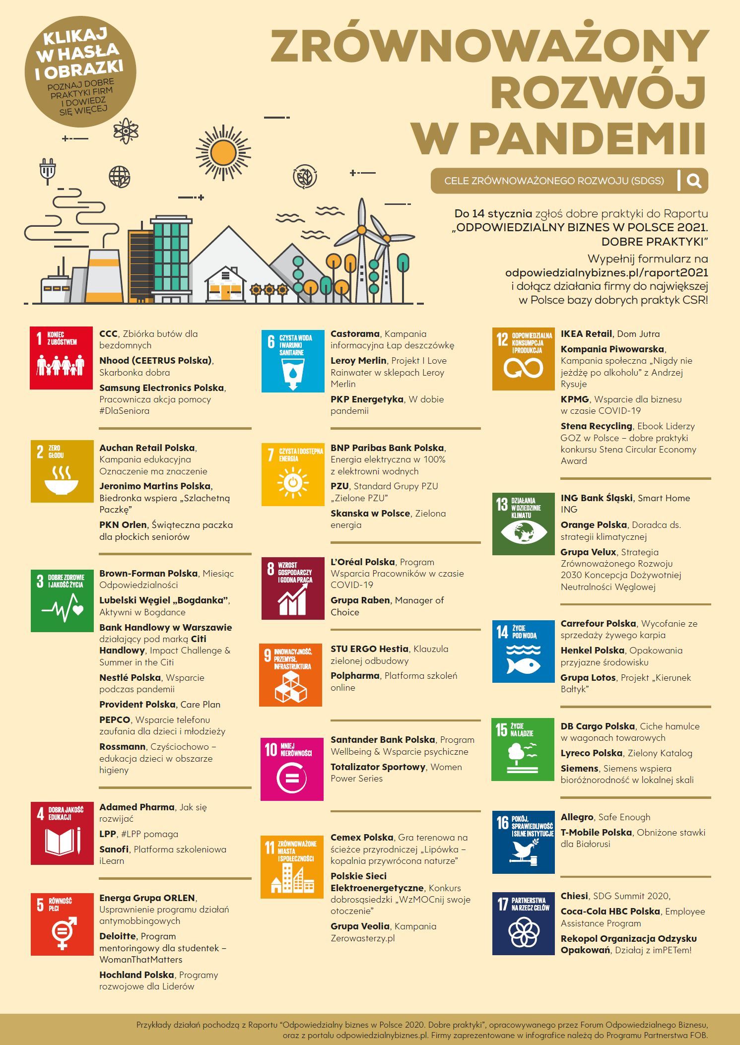 Firmy zaprezentowane na infografice należą do Programu Partnerstwa Forum Odpowiedzialnego Biznesu. Przykładowe działania zostały przyporządkowane do Celów Zrównoważonego Rozwoju ONZ: