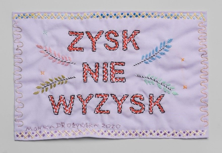 Od 16 listopada w centrum Warszawy i Krakowa można zobaczyć haft Moniki Drożyńskiej wyświetlany na ekranach z hasłem ZYSK NIE WYZYSK. Na zaproszenie Fundacji Kupuj Odpowiedzialnie artystka wypowiedziała się na temat sytuacji szwaczek, zarówno w Polsce, jak i na całym świecie.