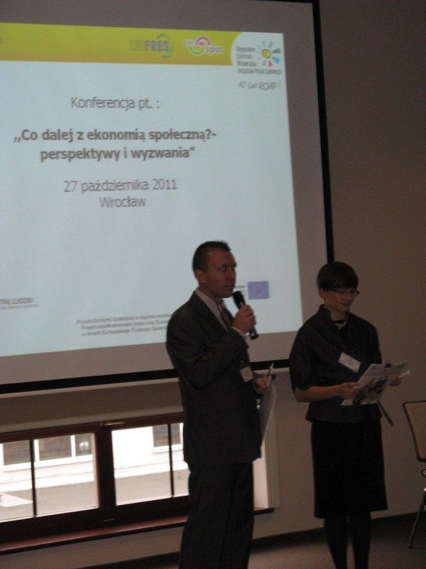 Wczorajsza (27.10.2011) konferencja pt. „Co dalej z ekonomią społeczną? – perspektywy i wyzwania” była przede wszystkim zaproszeniem do wzięcia udziału w dyskusji nad perspektywami rozwoju i wyzwaniami ekonomii społecznej we Wrocławiu. Organizatorzy pragnęli również stworzyć przestrzeń do refleksji nad obecną kondycją ekonomii społecznej, oraz do wymiany doświadczeń. W trakcie spotkania uczestnicy mogli więc nie tylko zapoznać się z Ustawą o przedsiębiorczości społecznej i przedsiębiorstwie społecznym, ale również porozmawiać o dobrych sposobach wdrażania idei ekonomii społecznej w innych rejonach Polski. W części panelowej miało miejsce kilka wystąpień, między innymi przedstawicielki Dolnośląskiego Ośrodka Polityki Społecznej – Weroniki Kurdziel, Piotra Masłowskiego z Centrum Rozwoju Inicjatyw Społecznych, który omówił „ustawę, której nie ma”, czyli tworzoną od 2009 roku Ustawę o przedsiębiorczości społecznej i przedsiębiorstwie społecznym. Zenon Matuszko z Fundacji Rozwoju Ekonomii Społecznej opowiedział o narzędziach wspierania spółdzielni socjalnych w ramach projektów realizowanych przez FRES i RCWIP.