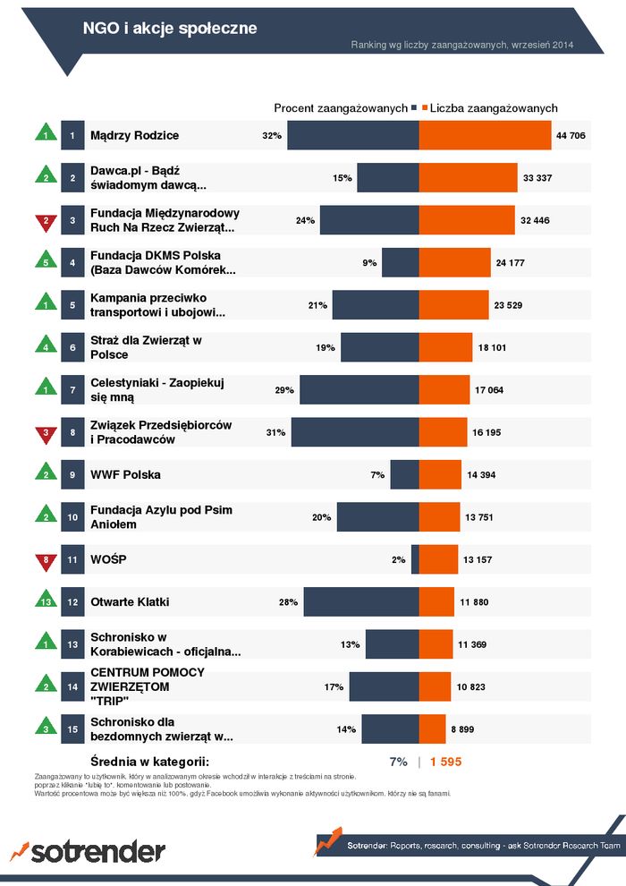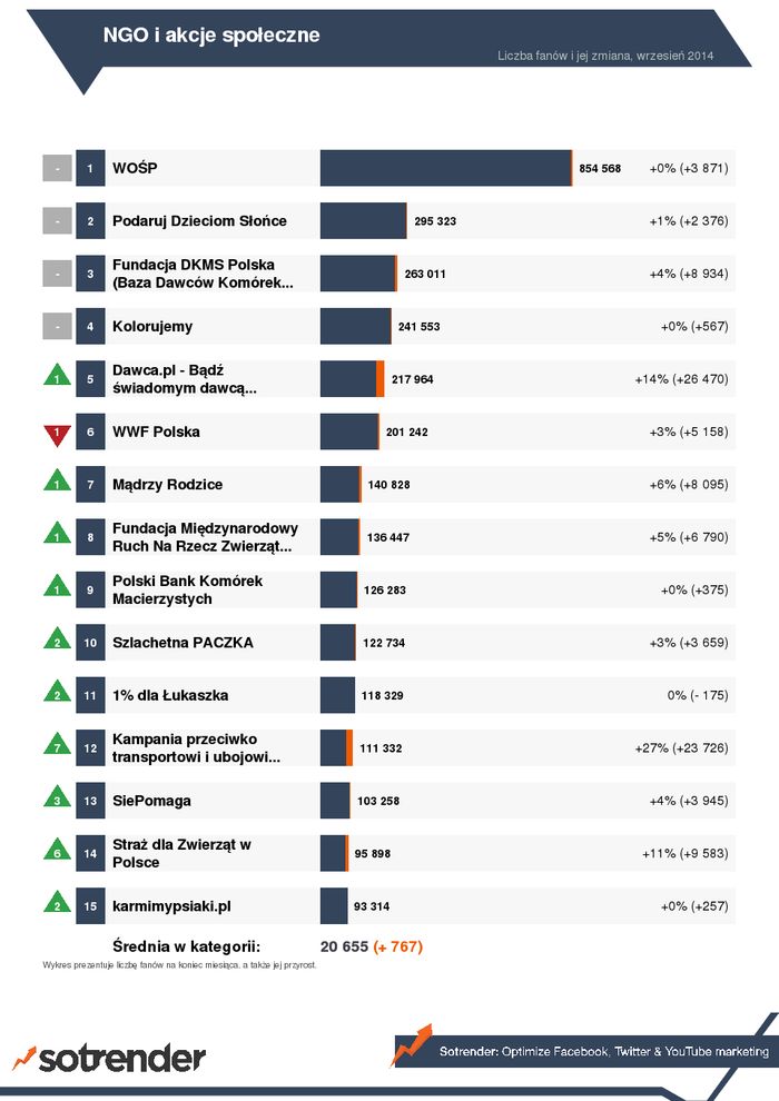 W samych zestawieniach Sotrendera do większych przetasowań w kategorii nie doszło. Najwięksi wciąż zyskują, profile nieaktywne potrafią tracić fanów. Największy skok w głównej tabeli odnotował wspomniany wcześniej profil Kampania przeciwko transportowi i ubojowi koni. Fanpage przeskoczył 7 innych profili i znajduje się na 12 pozycji.